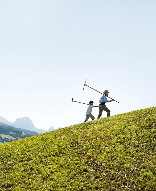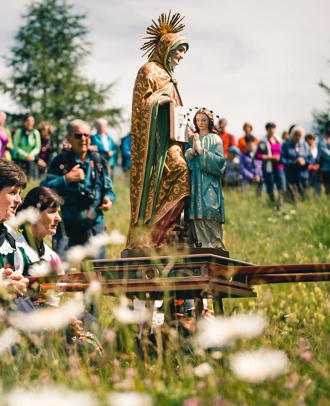 In summer, there is never enough time. From mowing the meadows and sowing the fields, to grazing the cows and transhumance, to processing wood and building houses and stables – the work is strenuous and the opportunities for spending time together are very rare. Religious festivals and life on the alpine pastures provide rare occasions to celebrate.