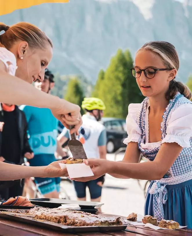 Cycling along the Sellaronda, you then face the Campolongo Pass for the second time, followed by the challenging Giau Pass, Falzarego Pass, Valparola Pass and finally the Mür dl Giat and arrival in Corvara.