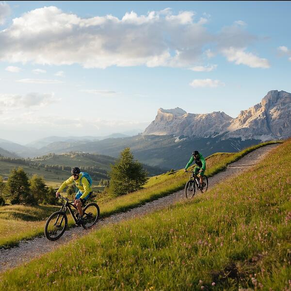 Von Corvara führen die Lifte Col Alto und Braia Fraida über einen Höhenweg zum Campolongo-Pass. Von hier aus geht es mit dem Sessellift hoch und dann mit dem Bike über einen spannenden Enduro-Trail wieder hinunter bis nach Arabba, zur Porta Vescovo-Kabinenbahn. An der Bergstation hat man einen atemberaubenden Ausblick auf den Marmolada Gletscher und den Fedaia-Stausee. Die anschließende Abfahrt bis zur Fodom Kabinenumlaufbahn oberhalb von Arabba ist besonders anspruchsvoll und verläuft teils auf einer steilen Schotterstraße und teils auf einem Trail. Vom Pordoijoch geht es über einen wunderschönen Trail nach Canazei und über die Dorfstraßen weiter nach Campitello, zur Col Rodella Bahn. Von Col Rodella fährt man bergab zum Sellajoch und weiter durch die Steinerne Stadt. Von der Steinernen Stadt führen zwei aufeinanderfolgende flow trails bis Plan de Gralba. Von Plan de Gralba führt ein Weg bis nach Wolkenstein. Von Wolkenstein aus fährt man mit der Umlaufbahn bis auf Dantercepies hoch. Kurz unterhalb der Bergstation beginnt die erste Abfahrt: ein flowiger Singletrail führt zum Grödner Joch, von wo aus es auf einem weiteren Trail bis nach Colfosco weitergeht. Der Weg führt dann zurück nach Corvara.