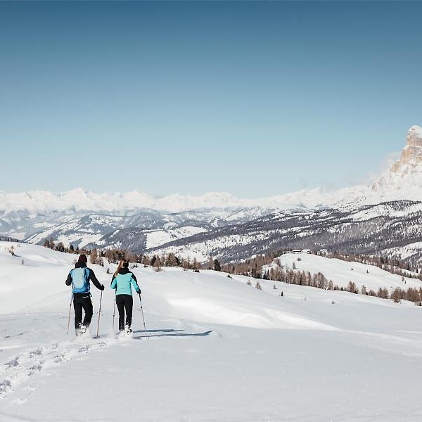 Leichte Schneeschuhwanderung in San Cassiano mit atemberaubendem 360°-Panorama über die Dolomiten, vom Marmolada-Gletscher bis zum Sassongher.