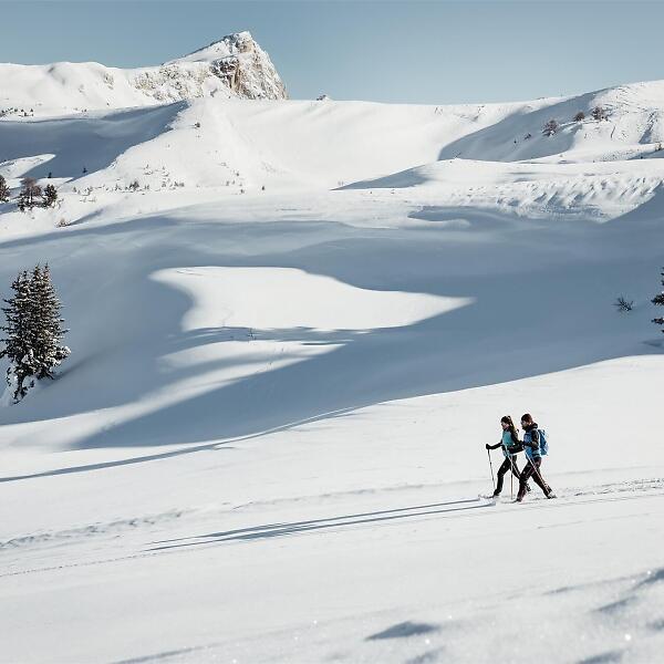 Die leichte Schneeschuhwanderung in San Cassiano führt in eine Winterlandschaft von zauberhafter Schönheit.