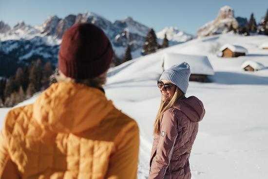 Entdecke den Zauber der Dolomiten UNESCO Welterbe, wo pures Vergnügen und atemlose Begeisterung auf dich warten. Mit Schneeschuhen erlebst du die stille, verschneite Winterlandschaft ganz und genießt dabei die Ruhe der Natur.