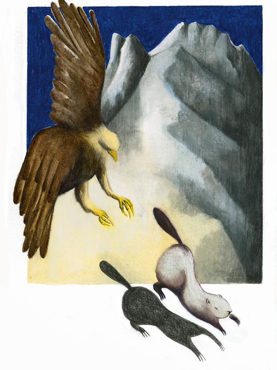 [...] Erst spät, als die Sonne versunken war und es zu dämmern anfing, kam hoch über den Abgründen der Südseite der Adler angeschwebt und in einem großen Bogen ließ er sich nieder. Er zupfte mit seinen goldenen Fängen behutsam an den Tüchern, die den Korb verhüllten, und betrachtete erst Dolasílla, dann das Murmeltierchen.