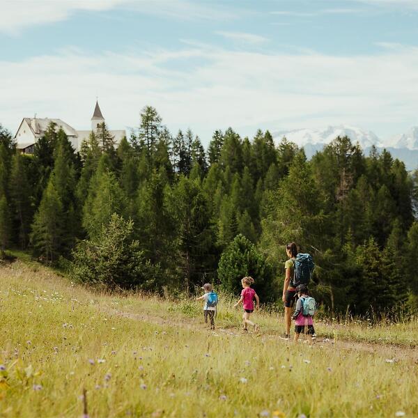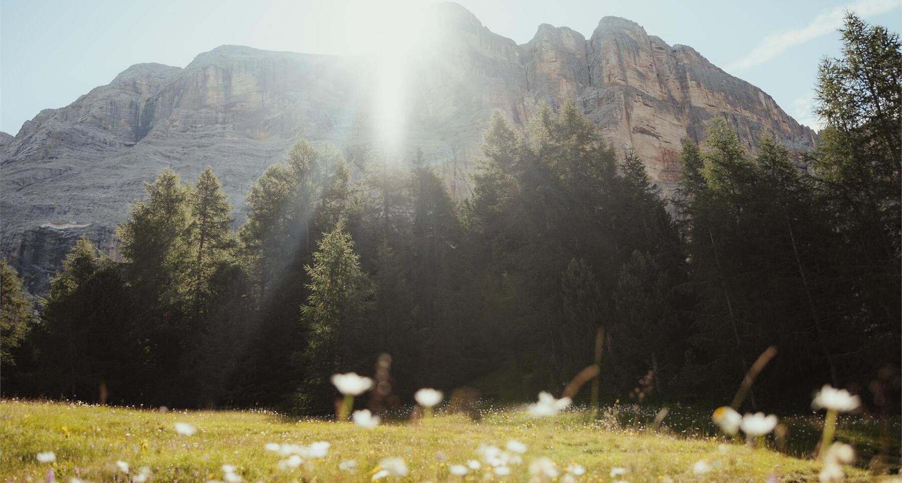 La Crusc – historischer Wallfahrtsort am Fuße des beeindruckenden Sas dla Crusc. Traumhafter 360°-Blick auf Marmolada, Grup dl Sela und die Alpen.