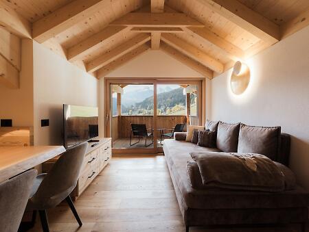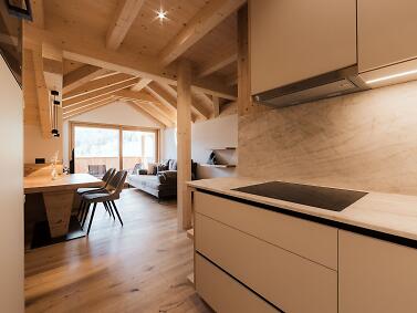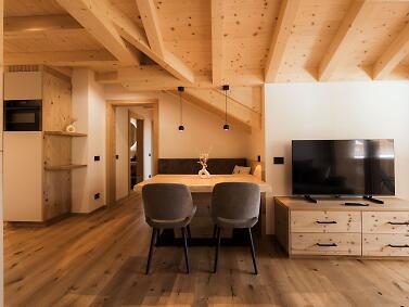 Experience a vacation immersed in the tranquility of the Dolomites without giving up comfort, in one of the two carefully designed apartments, built with fine and warm materials, and offering unforgettable breathtaking views.