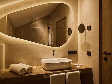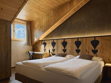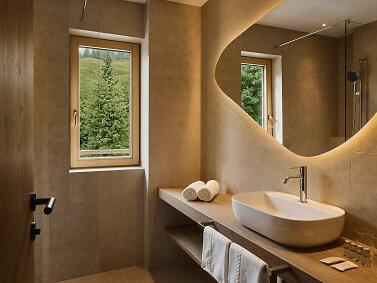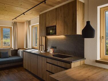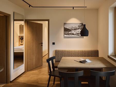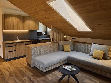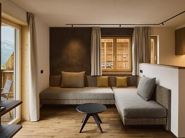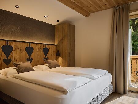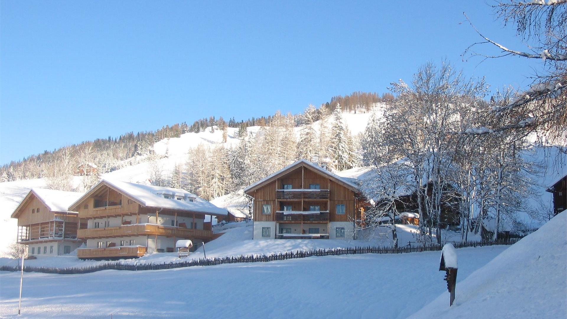 Our residence is located in a picturesque sloping meadow below Monte Croce, a 15-minute walk from La Villa. It is here, far from the hustle and bustle, that you will find your holiday in the rhythms of nature: sunshine, peace and the incomparable panorama of our mountains. You will live in an ecological house with environmentally friendly energy systems. It is in fact a ‘CLIMA HOUSE’. Pertaining to the house are the sun terrace, sunbathing lawn and playground. In the basement you will find a garage, ski room and our small wellness area with bio-sauna and loungers, infrared sauna, outdoor whirlpool and Kneipp.