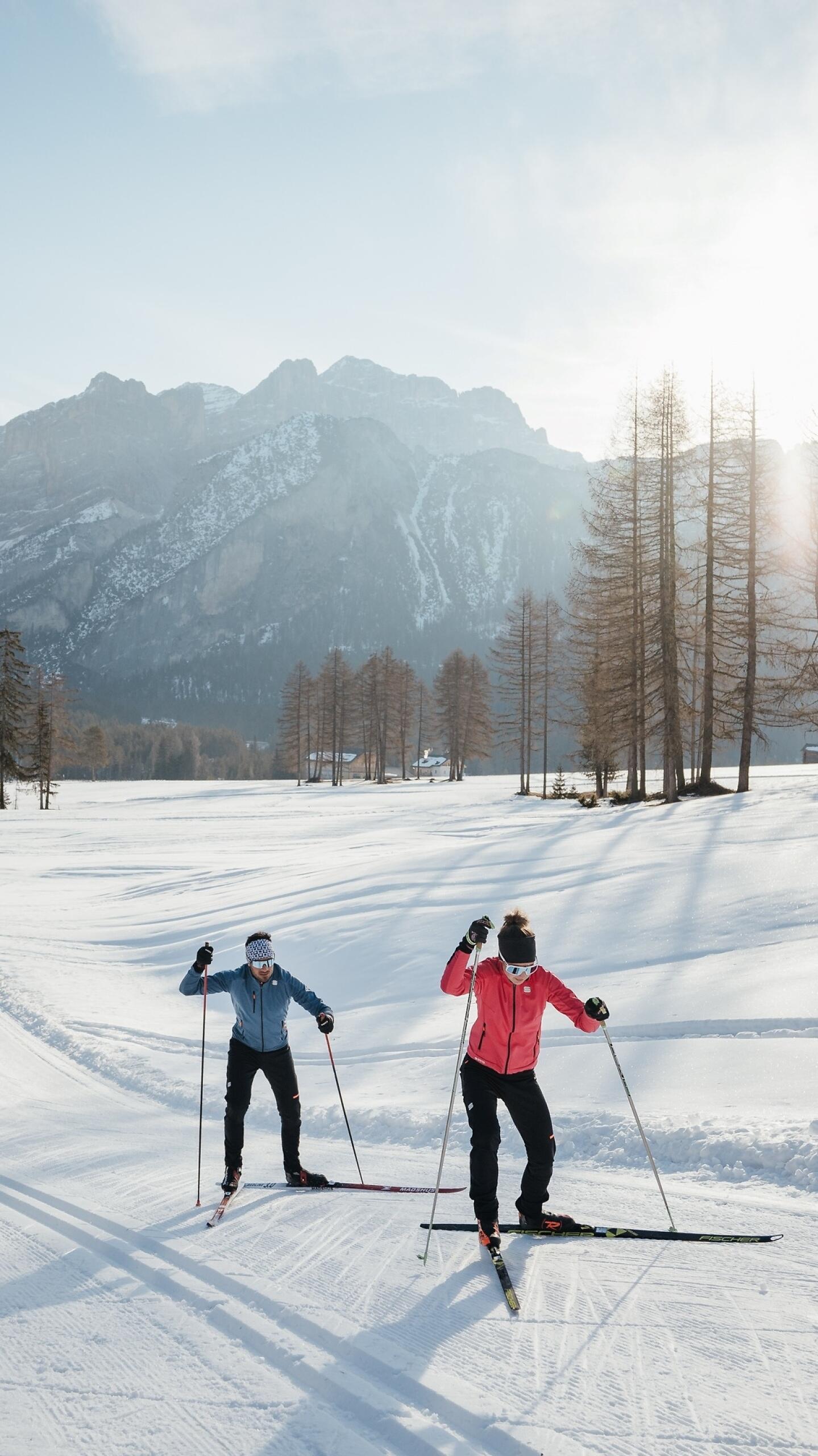 The cap pulled snug, the technical fabric moving with your body, arms and legs driving forward, before you stretches a whole day to savour, down to the last drop of energy. For those who love the rhythm of cross-country skiing, who crave lungs full of crisp mountain air, who seek that unique warmth only winter can offer, this is the place. Silent forests to glide through, open fields to cross at your own pace: all around, the Dolomite spires rising like stone cathedrals, inspiring the freedom to feel as light as a snowflake dancing in the air.