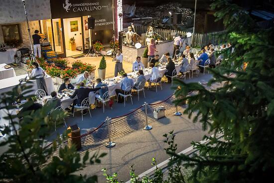 Relaxed, lively, and just a touch festive. An open-air dinner, live music in the background, good food, good wine, and the easy rhythm of a mountain evening.
