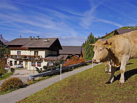 You only have to follow the few hairpin bends leading to the village located on 1,300 metres of altitude to realise that La Val is a world of its own. Meticulously mown meadows, centuries-old viles and more recent farmsteads coexist in perfect harmony, as well as the old and new barns. Grazing animals, well-maintained forests and imposing peaks - starting with the mountains Sas dla Crusc - Sasso Santa Croce and Cima Nove which form an astonishing amphitheatre. It’s for a very good reason, and probably even more than one, that La Val has been part of the European Hiking Villages since 2015: this is where the relationship between people and nature is based on mutual respect, something that the hiker who comes across this area realises at first sight. Gratefully.