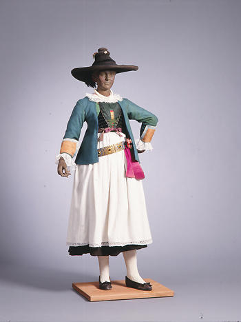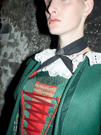 Il “goller”, da collo, è un colletto pieghettato decorato con pizzi. La giacca, in loden blu leggero, lunga fino ai fianchi, presenta cuciture arcuate e taglio a campana con polsini. Il corpetto, chiuso con lacci, è bordato da ampie fasce di gallone verde chiaro su fondo rosso in loden. La pettorina è rifinita da nastri di seta verde scuro, mentre la schiena è completamente coperta da nastri di velluto verde trapuntati, lasciando intravedere solo in pochi punti il broccato rosso dorato sottostante. Caratteristica pusterese è la punta superiore del corpetto. Anche qui, tuttavia, l’autenticità dell’insieme rimane incerta.