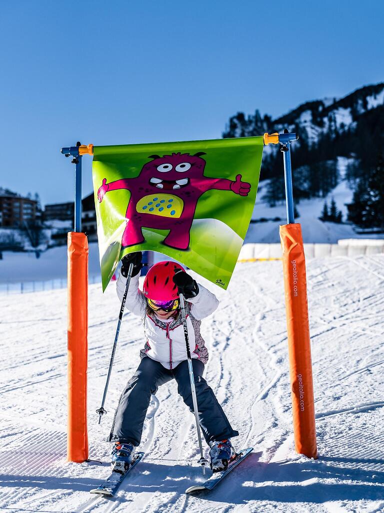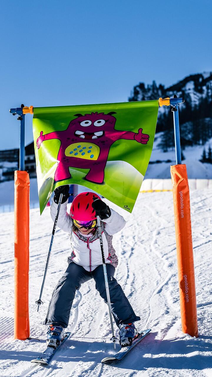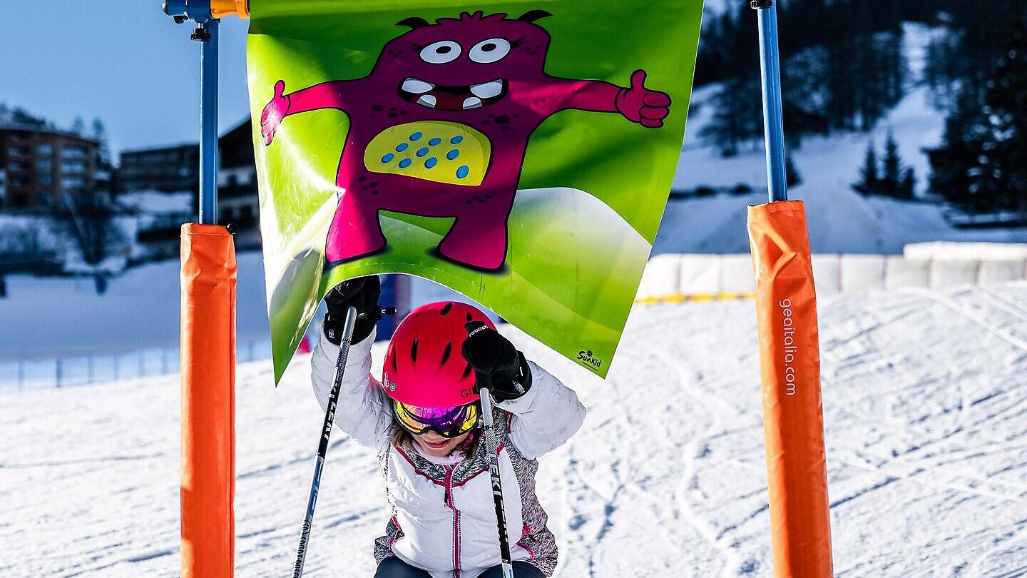 Fun for the little ones in the large beginner area by the Pezzei ski lift in Colfosco. The Kids Funpark Colfosco, equipped with arches, jumps, snow tunnels, and interactive obstacles, teaches youngsters the basics of skiing or snowboarding while having a blast. Give me five!
