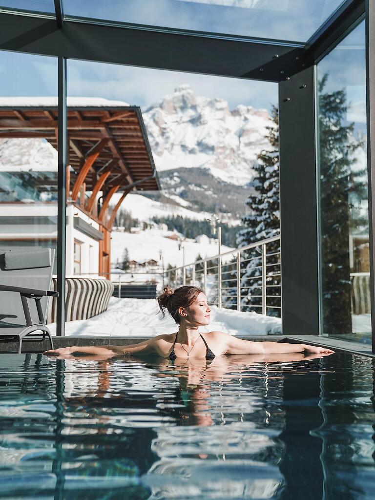 Indulge in a rejuvenating wellness day at Ciasa Soleil, available daily from 10:00 AM to 3:00 PM for 95€ per person. Enjoy exclusive access to our wellness facilities, where the panoramic indoor pool provides a serene escape with stunning views of the Dolomite mountains. Unwind in our wellness centre, featuring a Finnish sauna, bio sauna, infrared sauna, steam bath, and peaceful relaxation areas.
