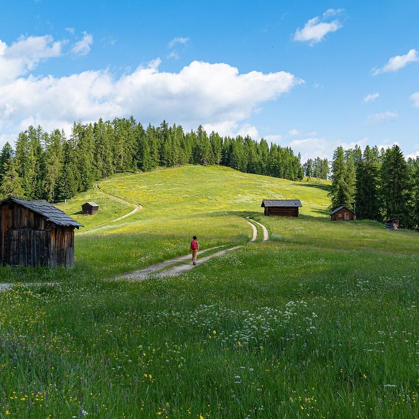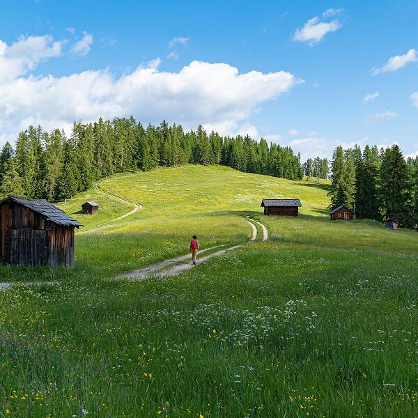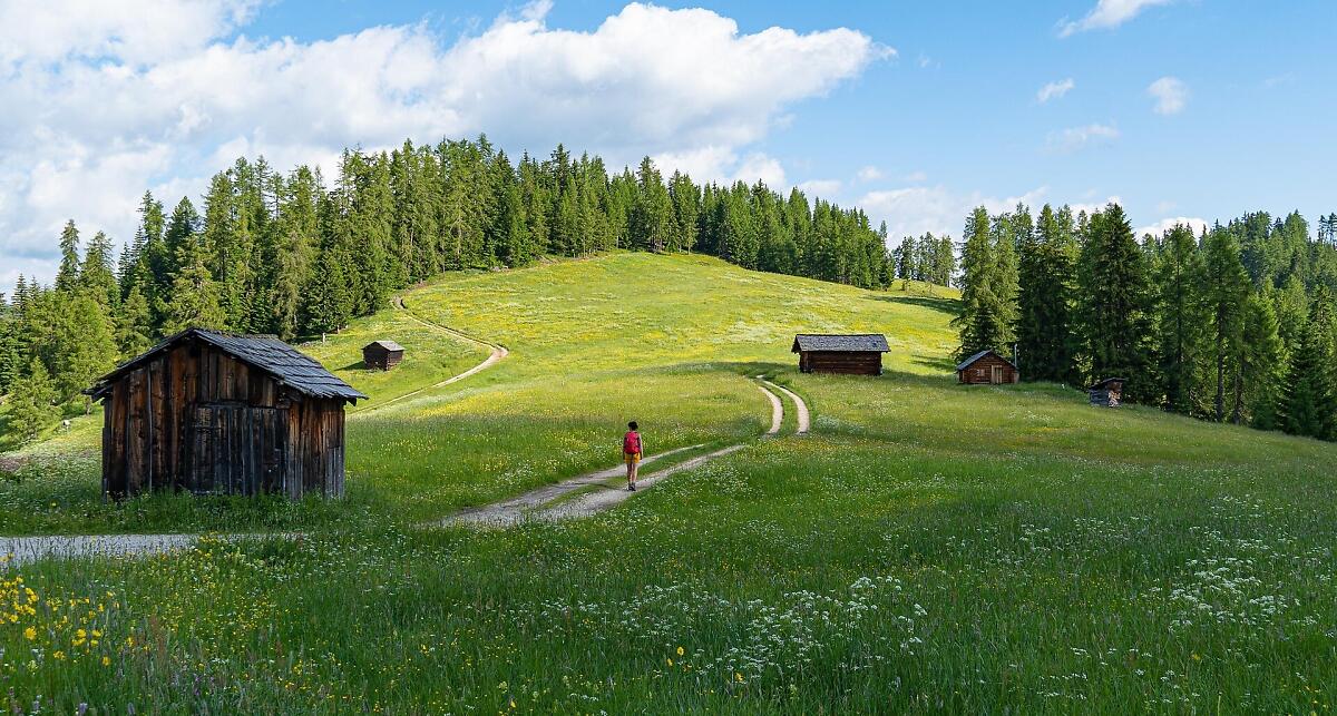 From here, take trail no. 15B, which runs along the Sas dla Crusc mountain walls until you reach the La Crusc hut and its namesake small church (2045 m). Follow path no. 15 for a short distance, then continue left on path no. 15A to the Ütia Ranch da André hut, crossing the magnificent Armentara meadows. Continue downhill on path no. 18A through the forest to the hamlet of Al Bagn. From here, proceed along the paved road until you reach the center of La Val. You can also divide the hike into several stages, with taxis available to assist as needed.