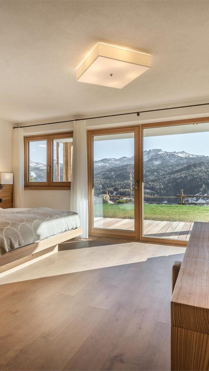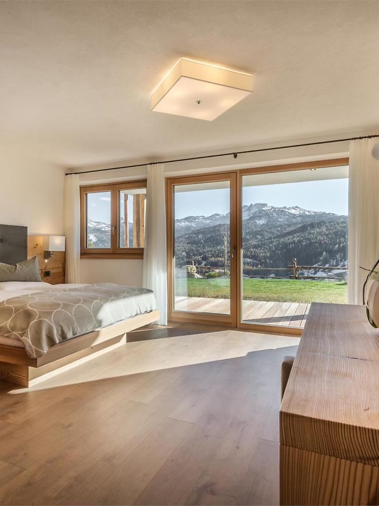Il nostro Chalet di montagna che sovrasta il piccolo paese di San Cassiano offre appartamenti esclusivi che sanno coniugare modernità con gli elementi delle tradizioni ladine. Gli arredi in materiali naturali e le ampie vetrate panoramiche che portano luce negli interni creano un contatto diretto con le Dolomiti. Ambienti spaziosi e accoglienti in materiali naturali, per sognare, rilassarsi e sentirsi a proprio agio. Gli appartamenti sono dotati di 1 o 2 camere matrimoniali e divano letto per 1-2 persone in soggiorno. Cucina con lavastoviglie, frigorifero con cella freezer, piastra elettrica a induzione, forno a microonde. 1 stanza da bagno con doccia o vasca, lavandino, wc, bidet, fon, scalda asciugamani, pavimento riscaldato. Ampio balcone verso sud con vista panoramica sulle Dolomiti. TV-Sat, Internet WI-FI, cassetta di sicurezza, biancheria da letto, da bagno e da cucina completano la dotazione degli appartamenti. Inoltre la nostra casa dispone di: parcheggio privato, garage, prato/giardino, deposito biciclette e deposito sci con asciuga scarponi. Tutti gli appartamenti sono per non fumatori