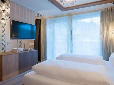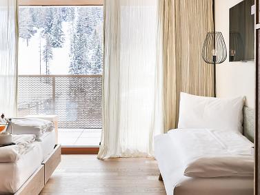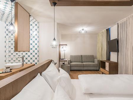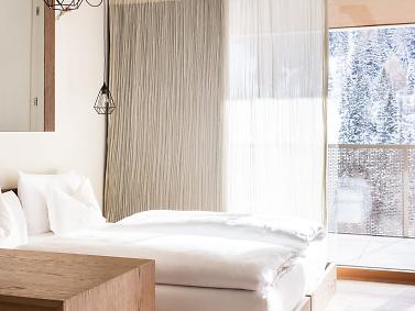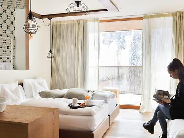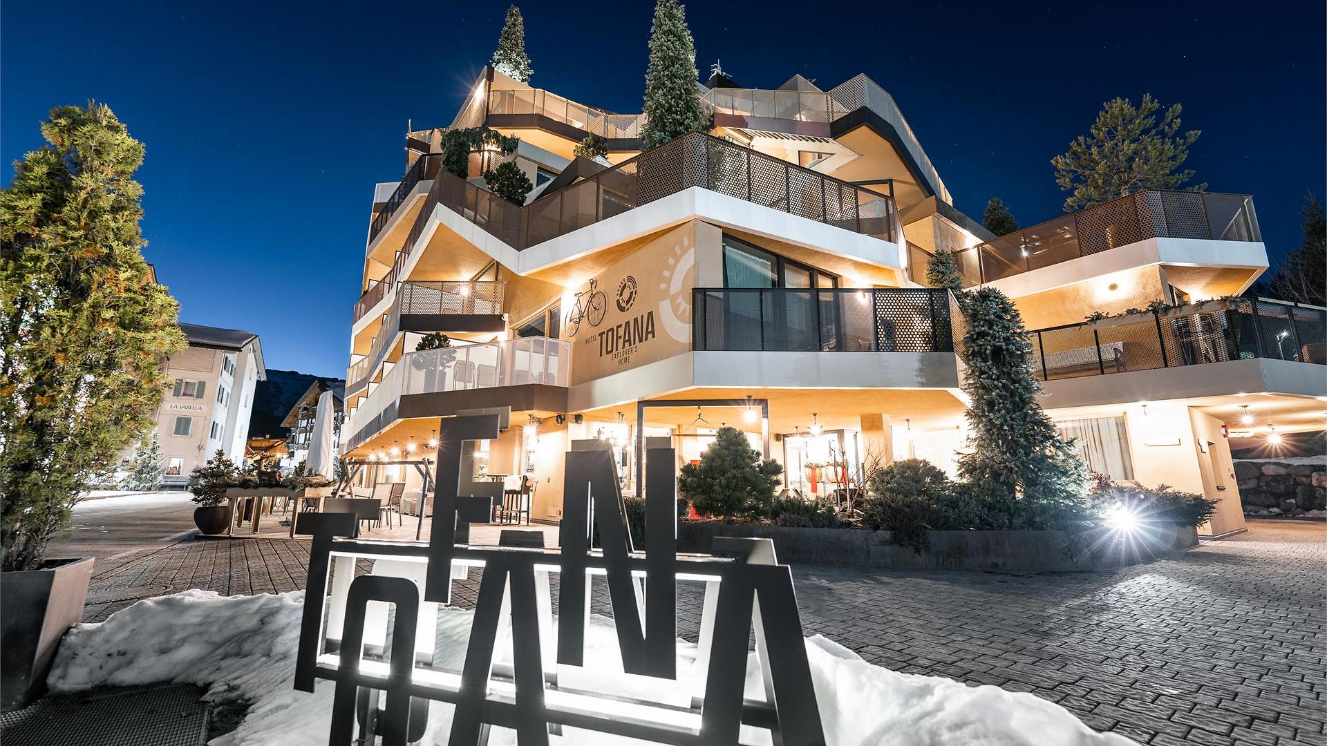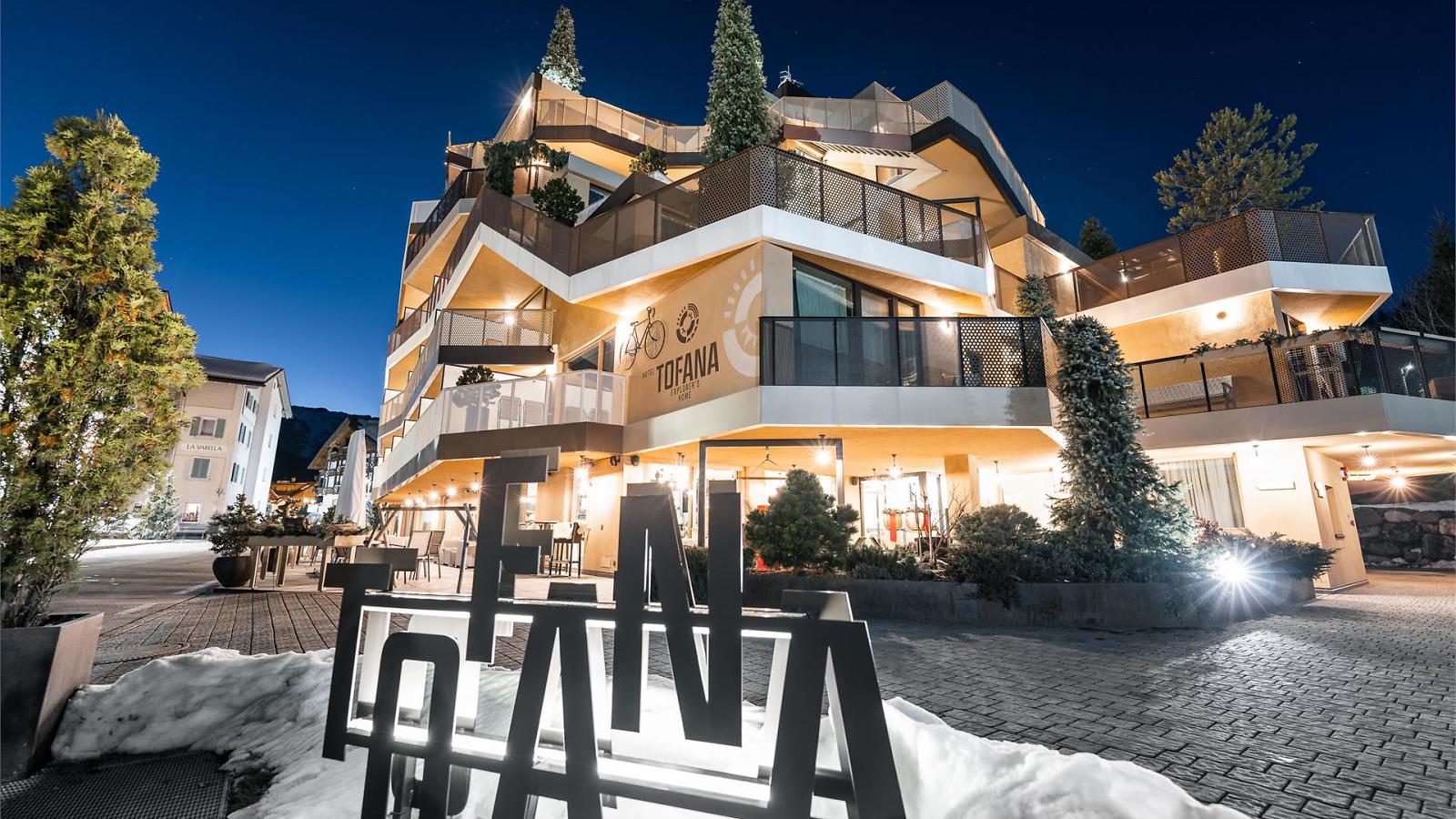 “Volevamo che la nostra passione per la montagna si percepisse subito” Verena e Günther Nasce così un progetto insolito. Qualcosa di nuovo fuori e dentro. La zona wellness panoramica nei piani alti e, le ampie vetrate nelle camere, le grandi terrazze danno la sensazione di essere già fuori in mezzo alla montagna. Questo è l’Hotel Tofana