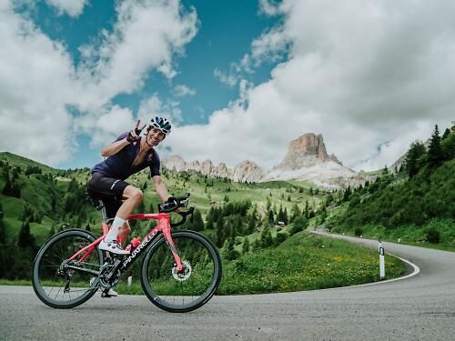 Si pedala lungo la Sellaronda, affrontando poi una seconda volta il Passo Campolongo, seguita dall’impegnativo Passo Giau, Passo Falzarego, Passo Valparola e, per concludere, il Mür dl Giat e arrivo a Corvara.