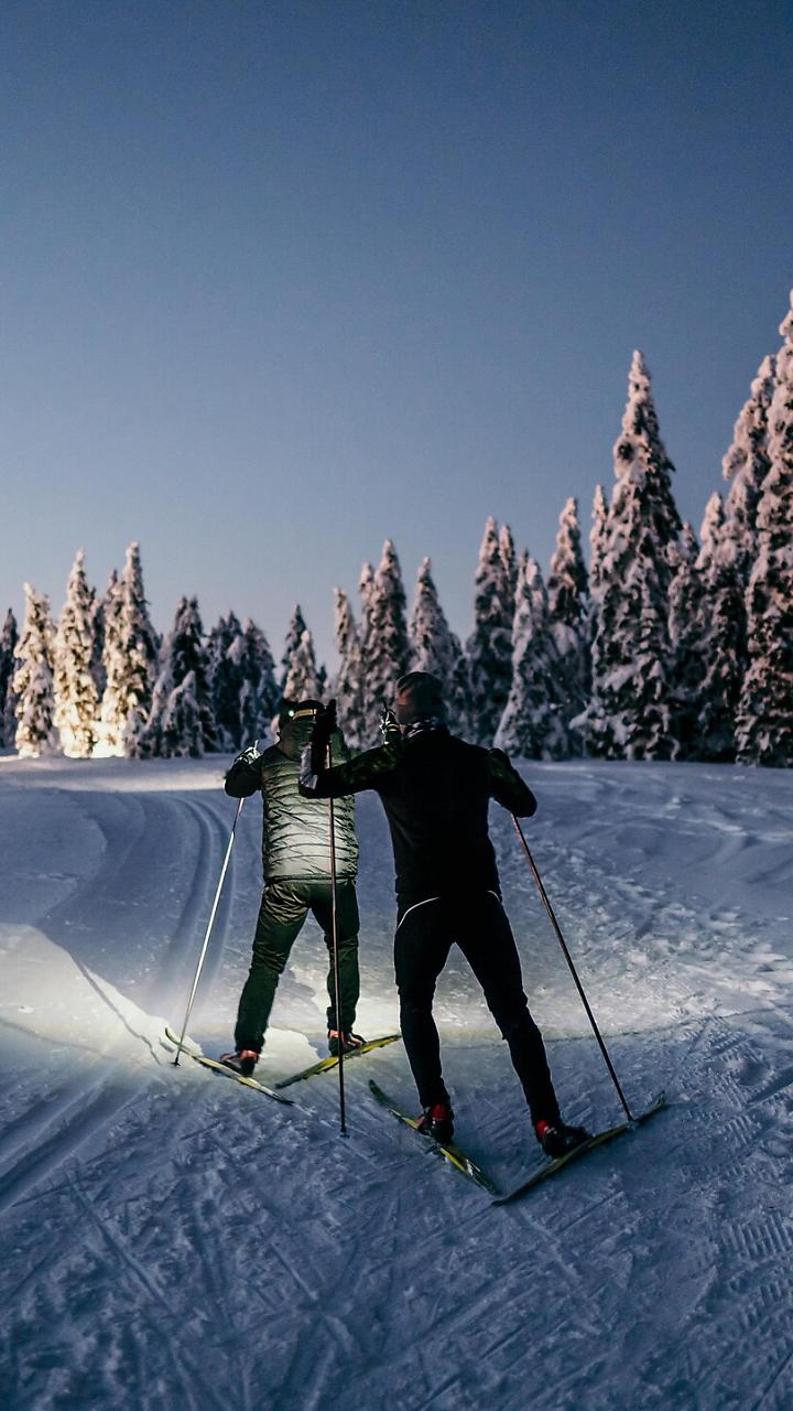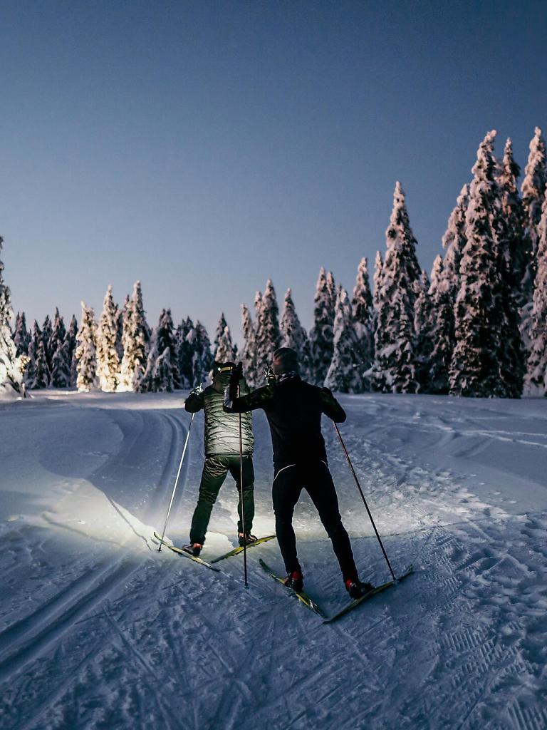 Scivola sugli sci da fondo in un’atmosfera incantata, tra neve silenziosa, luci calde e il bagliore d’argento della luna piena.