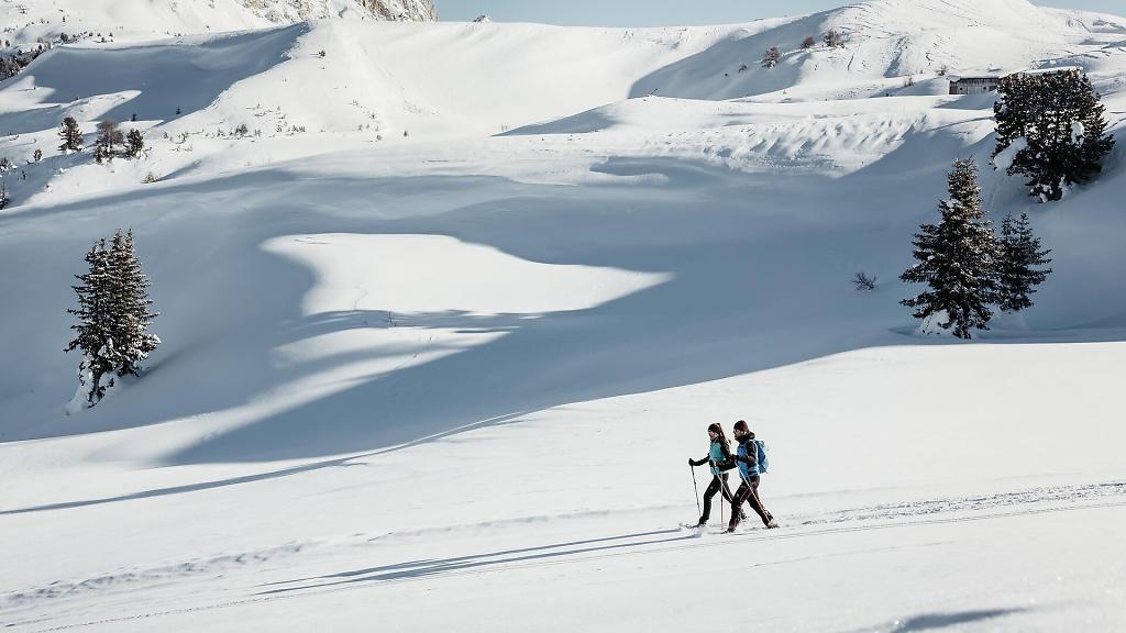 Ciaspolata guidata medio-impegnativa attraverso i boschi e i prati dello Störes fino al punto panoramico dell'altipiano del Pralongiá.