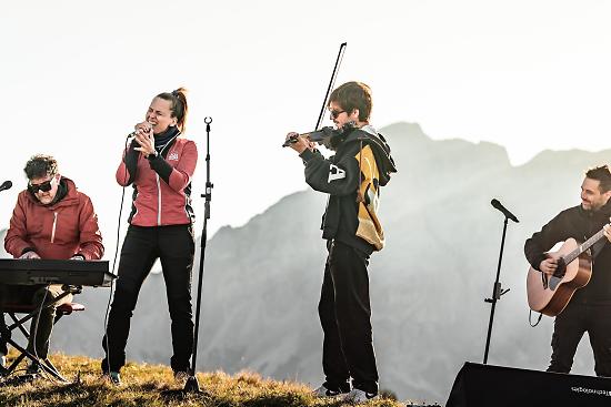 Il concerto si svolge immerso nel silenzio dell’aurora, tra le sfumature dorate del cielo e il profilo inconfondibile delle montagne. Le note si fondono con il paesaggio, regalando emozioni intense e un inizio di giornata davvero straordinario.