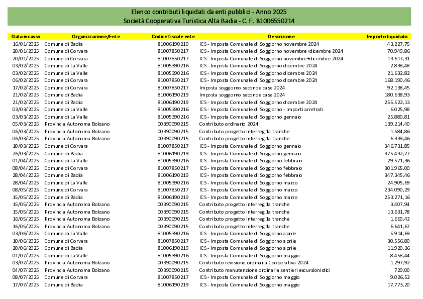 Ai sensi della Legge No. 124/2017 informiamo che la Società Cooperativa Turistica Alta Badia ha beneficiato dei seguenti contributi pubblici: