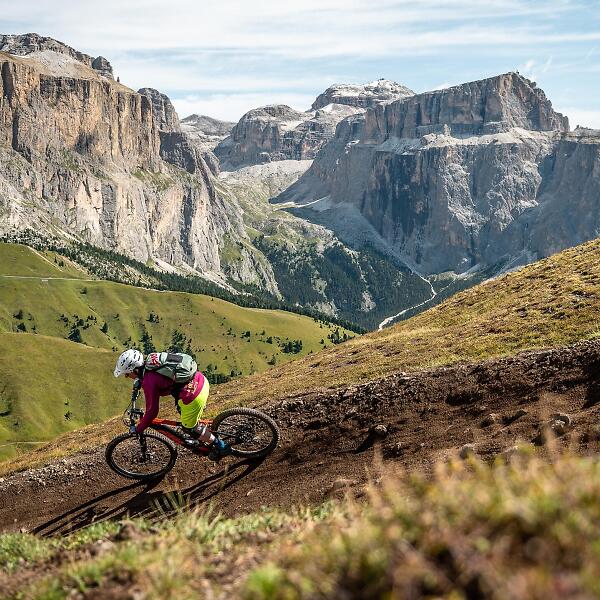 Le spettacolari vette e i leggendari paesaggi delle Dolomiti: il giro del gruppo del Sella, conosciuto come Sellaronda, è uno degli itinerari più belli e più amati delle Alpi che offre sia d'inverno che d'estate molte interessanti possibilità. In estate tra l’altro lo si può fare in mountain bike. Per il Sellaronda MTB Tour è richiesta una buona condizione fisica ed esperienza di pedalata anche su terreni tortuosi. Da alcuni anni, grazie alla possibilità di affrontare le salite più ripide con gli impianti di risalita, l’intero giro si può compiere in un giorno.